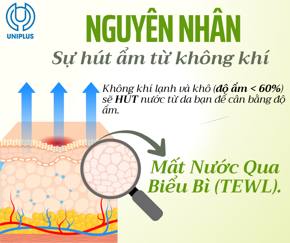 Mất Nước Qua Biểu Bì (TEWL) Tăng Vọt: Không khí lạnh và khô bên ngoài, cùng với máy sưởi trong nhà, làm tăng tốc độ nước bay hơi khỏi da. Đây là cơ chế HÚT ẨM từ chính làn da của bạn.