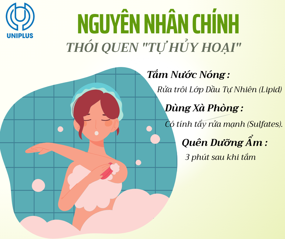Tắm Nước Nóng Quá Lâu: Nước nóng không chỉ làm khô da tạm thời mà còn rửa trôi lớp dầu tự nhiên (lipid), làm suy yếu hàng rào da.