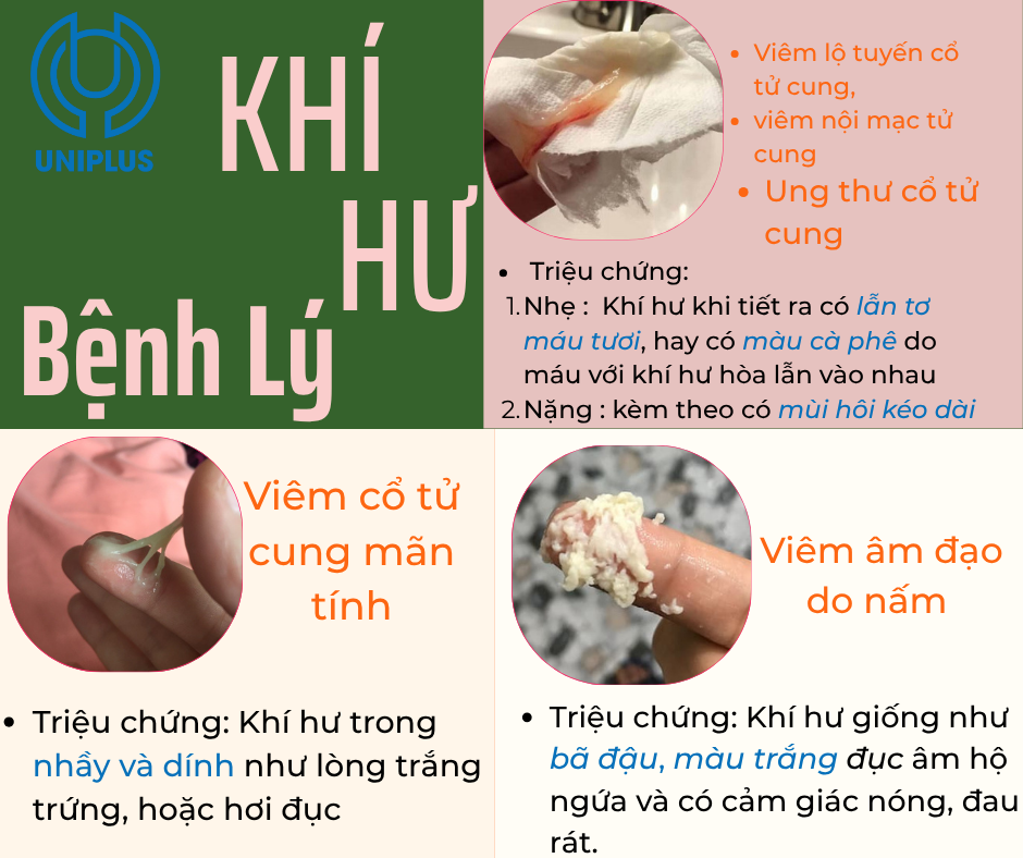 – Triệu chứng: Khí hư ra nhiều, hoặc có kèm theo các bất thường khác, hoặc có biểu hiện ngứa âm hộ, đau bụng dưới.