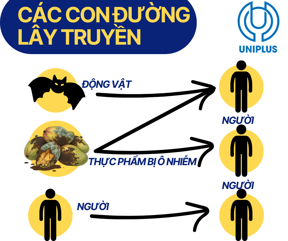 Từ động vật sang người: Thông qua tiếp xúc trực tiếp với dịch tiết (nước tiểu, nước bọt) của dơi hoặc động vật trung gian (phổ biến nhất là lợn).